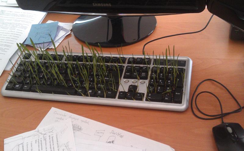 Мужчина Проросшая клавиатура. Пока начальник был на неделю в отпуске - клавиатура чуть проросла.