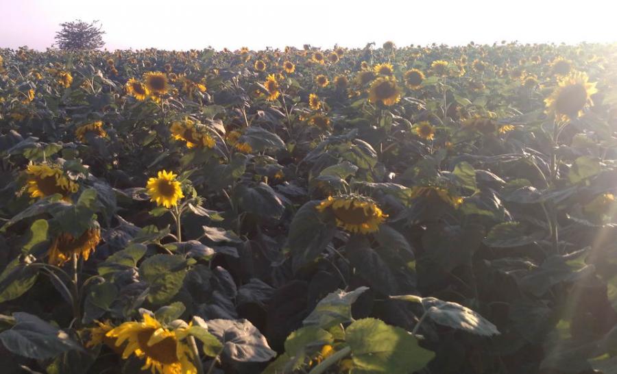 Мужчина Огромное поле с подсолнухами у междугородней трассы - летний вечер.