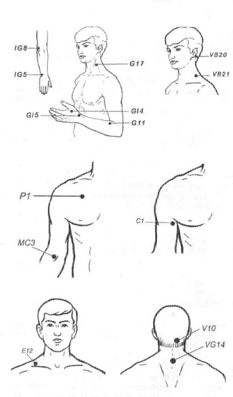 Одну руку нужно положить на лоб пациента, а подушечкой большого пальца другой провести вдоль заднего края грудино-ключичное-осцевидной мышцы — от точки УВ20 фэнчи до точки 0117 тяньдин. Рукой, лежащей на лбу, наклоните голову на 45° в больную сторону, а большим пальцем другой руки надавите на точку 0117. Время надавливания — 12 минуты. Положите большой палец на точку Е12 цюэпэнь и, постепенно увеличивая силу, надавите вниз в течение 1 минуты. Затем 1 минуту давите от спины к центру, воздействуя на комплекс нервов около 1го грудного позвонка. После прекращения надавливания должно возникнуть ощущение тепла по всей руке. В течение 1 минуты производите прерывистое надавливание на точку Р1 чжунфу. Удерживая циу двумя руками руку пациента в области луче-запяспин что-то о сустава, поднимите ее и потяните вверх. Возьмите руку пациента в лучезапястном суета не, поднимите ее вперед и вверх до вертикального положения, затем отведите в сторону, натяните и с натяжением опустите вниз, нажимая большим пальцем второй руки на точку С1 цзицюань. При этом пациент чувствует онемение в пальцах руки. Затем поверните руку пациента на 30что-то наружу, нажимая повторно на точку С1. Он ощущает поток тепла и легкость. Вложение 1466 |