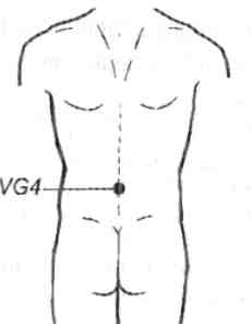 Пациенту следует лечь на живот и положить под себя подушки, чтобы при массаже избежать резкой боли. Промассируйте поглаживанием область вдоль меридиана мочевого пузыря с двух сторон от точки VII до точки У25 (Рис. 1). Затем большим пальцем промассируйте точки У23 шэньшу, У04 минмэнь (Рис. 3) и от У31 шанляо до У34 сяляо. Массаж проводится прерывистым давлением до появления интенсивного покраснения и ощущения тепла. После процедуры пациент обязательно должен сделать легкое вращение в талии, наклоны и растяжения.