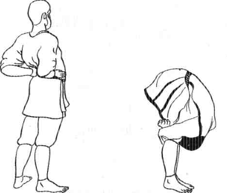 Поставьте ноги на расстояние широкого шага, держа корпус прямо, а руки на поясе. Запрокинув голову назад, сделайте глубокий вдох, так чтобы грудная клетка при этом поднималась. Выдыхая, расслабляйтесь. По окончании, не меняя положения, начните выполнение следующего упражнения (Рис. 57).