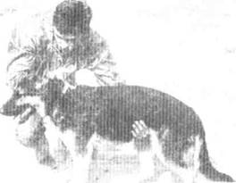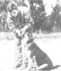 Рис. 8. Приучение щенка становиться по команде «Стоять», нажимая под живот левой рукой