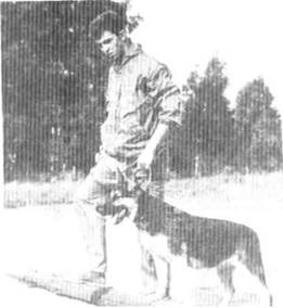 Рис. 11. Приучение щенка преодолевать невысокие препятствия опорным прыжком