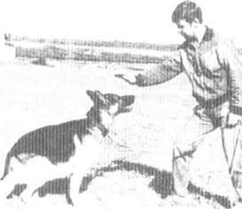 Рис. 14. Приучение собаки ложиться по жесту с применением лакомства