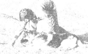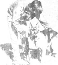 Рис. 13. Приучение собаки ложиться по команде при помощи поводка и нажима на холку