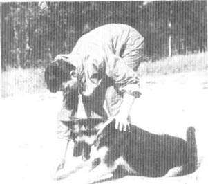 Рис. 8. Приучение щенка становиться по команде «Стоять», нажимая под живот левой рукой