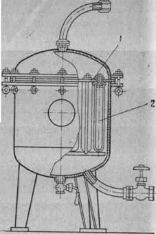 Мужчина Керамический фильтр (рис. 78) представляет собой цилиндрический сосуд со сферическим днищем и крышкой. Между корпусом и крышкой закреплена решетка /, в которой установлены фильтрующие элементы — патроны 2 из пористой керамики со сферическим днищем.