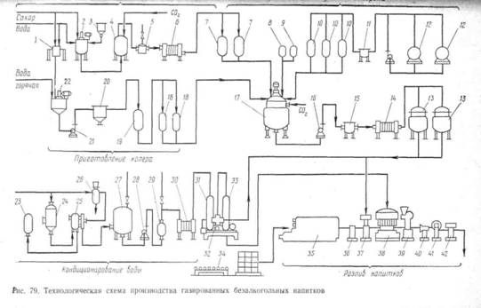 Способы приготовления газированных безалкогольных напитков. На рис. 79 приведена технологическая схема производства безалкогольных напитков.