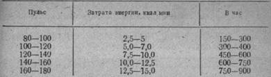 Если предложенный комплекс выполнять максимальное число раз при пульсовом режиме 130–140 ударов в минуту, он дает хороший общетренирующий эффект. А примерный расход энергии для определения достаточности физической нагрузки поможет определить ориентировочное соотношение энергетических затрат и частоты пульса по данным Bouha (табл. 10).