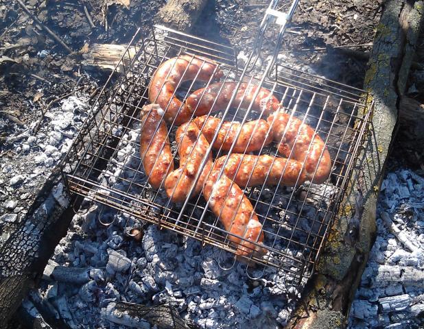 До шашлыков еще не дошли, т.к. спонтанно вышли в лес, зато свино-говяжие сосиски поджарили на костре.