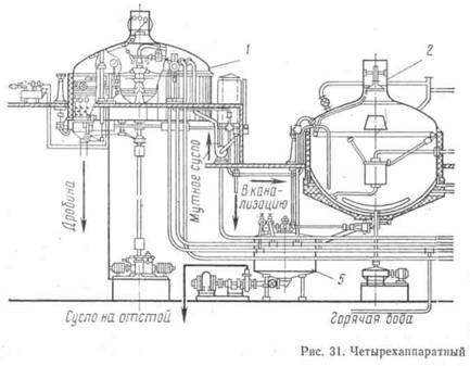 Заторные котлы четырехаппаратного агрегата находятся в работе не более 50% времени, поэтому для двух рядом установленных таких агрегатов число заторных котлов можно сократить вдвое. В результате получается один шестиаппаратный агрегат с удвоенной производительностью.