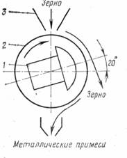 Зерно, поступающее на переработку, очищают от кусочков проволоки, металлической окалины, гвоздей и др. на сепараторе с постоянными магнитами или на электромагнитном барабанном сепараторе (рис. 11), который состоит из ряда неподвижных сердечников, намагничиваемых электрическим током, протекающим в катушках. Вокруг электромагнита вращается барабан 2 Из немагнитного материала (алюминий, латунь). Из воронки 3 На вращающийся барабан попадает зерно; металлические частицы притягиваются к поверхности барабана и удерживаются на ней, пока не выйдут из Магнитного поля. Вложение 1616Вложение 1617 |