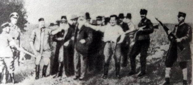 Гитлеровцы и их холопы — оуновцы позируют перед фотообъективом за несколько минут до расправы с группой евреев. В белой рубахе — агент гестапо Алексей Левандовский, укрывающийся ныне в Канаде (село Потичок Станиславской области, октябрь 1941 г.). |