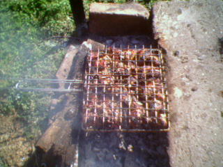 Главное чтобы была свежая свининка, лучше антрекотная часть, или шея, подойдут и нежирные ребрышки. Все это дело нарезаю и мариную. Для маринования использую соль, лук, черный перец, хмели сунели, лаврушку и никакого уксуса, лучше потом сок лимона (укссус убивает аромат мяса). Через несколько часов завожу огонь в мангале. Дрова использую от фруктовых деревьев, тогда будет шашлык ароматным. Когда образуются угли, шампуры на мангал и следить, чтобы не пересушить. Можно поливать сухим вином или соком лимона. Как в разрезе куска течет чистый сок, так и к столу. Хороша к шашлыку осетинская водочка "Пшеничная слеза", только чтобы замороженная до степени тягучести, или доброе винцо. Не повредит и бокальчик холодного пива. К нему подойдет осетровый балычок из Кизляра, или кутум. На столе, к шашлыку, овощи, зелень, осетинский сыр. Также и готовлю шашлык из осетрины, только для маринования использую только соль, лук-кольцами, черный перец. После приготовления - поливаю соком лимона и те же напитки к шашлыку, только не в больших количествах, всего должно быть в меру. |