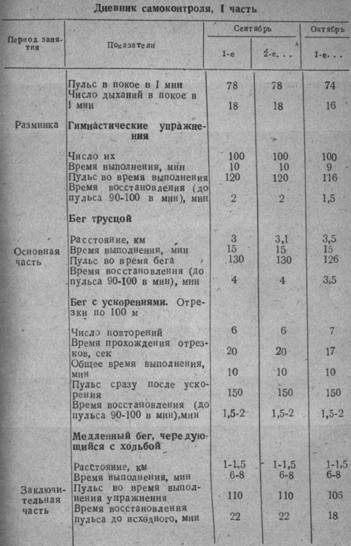Эффективность самоконтроля повысится, если ежедневно записывать его данные в дневник. Дневник самоконтроля состоит из двух частей. В первой ежедневно отмечают содержание и характер тренировочной работы: объем, интенсивность, при каком пульсовом режиме она проходила, срок восстановления пульса после окончания тренировки. Эти данные можно записывать в виде таблицы (см. табл. 11). Во второй части отмечают величину нагрузки предыдущего дня, общее состояние, которое характеризуется самочувствием, состоянием аппетита и сна, работоспособностью и т. д. (см. табл. 12).