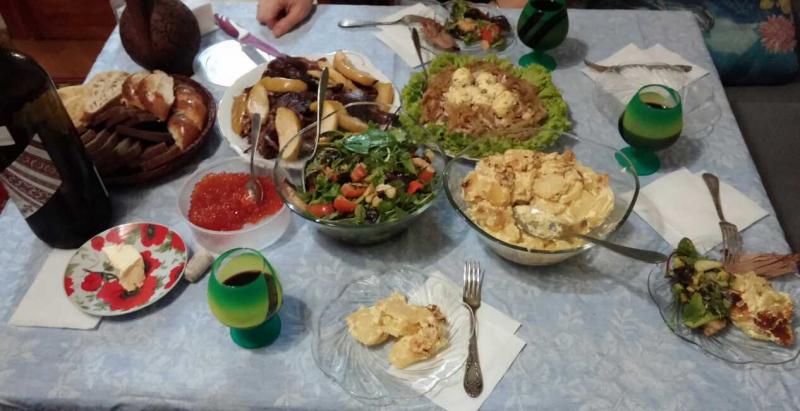 При входе в дом мы произносили такие слова:"Добрый вечiр, з святим вечером, просили батько та мати прийняти нашу вечерю." Нас приглашали за стол, а на столе обязательно кутя, узвар из сухофруктов, фаршированный орехами чернослив, вареники с картошкой и капустой, заливное из судака. После угощения мы получали подарки и направлялись к следующим родственникам. Было здорово, да если еще морозец со снегом. Единственное стеснялись ходить с узлом и ждали пока стемнеет.