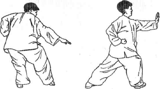Отставить правую ногу назад и принять правую стойку «ложная нога», одновременно отводя правый кулак назад вплотную к груди. Затем выбросить правую ногу в правую стойку «лук и стрела» и одновременно произвести удар кулаком правой руки. При этом левая ладонь должна находиться рядом с правой подмышкой (Рис. 103). Вообразите себя драконом, бросающимся вперед.