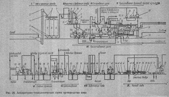Для обеспечения чистоты брожения семенные дрожжи периодически заменяют дрожжами чистой культуры, получаемыми из одной клетки в стерильных условиях. Для размножения дрожжей чистой культуры охмеленное сусло после очистки его в сепараторе 18 стерилизуют в аппарате 26 и перекачивают в бродильные аппараты 27 и 28, в которые вводят чистую культуру дрожжей (из лаборатории). Дальнейшее размножение дрожжей происходит в танке 60.