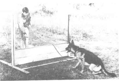 Рис. 26. Приучение собаки двигаться по лестнице при помощи лакомства Рис. 27. Приучение собаки двигаться по буму при помощи лакомства и поводка Рис. 28. Приучение собаки входить в водоем за апортировочным предметом по команде и жесту Рис. 29. Приучение собаки не брать пищу, предлагаемую посторонним человеком |