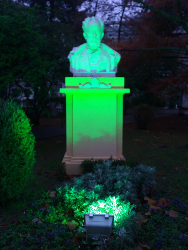 Памятники Чайковскому и Глинке, в одном из сквериков, тоже в неизменно неоновой, зелено-кислотной подсветке.
