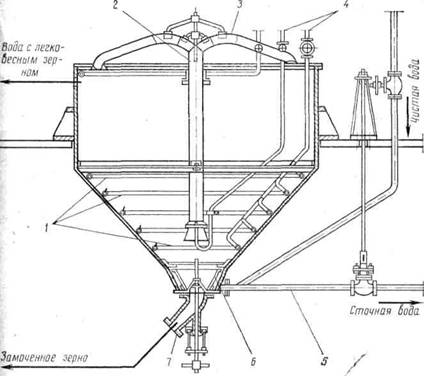 Для того чтобы обеспечить подачу зерна в замочные чаны и выгрузку его из замочных чанов самотеком, отделение для замачивания размещают между зернохранилищем и солодовней. При замачивании проводят мойку зерна, удаление неполноценных зерен, дезинфекцию и активацию их жизнедеятельности посредством аэрации и удаления образующегося диоксида углерода. Мойку зерна и замачивание осуществляют в открытых замочных чанах, оборудованных водяной и воздушной коммуникациями для подачи свежей воды и сжатого воздуха, устройствами для аэрации, перемешивания и перекачивания зерна. Замочный чан (рис. 12) для солодовни периодического действия представляет собой цилиндрический сосуд с коническим дном. По поверхности конического днища укреплены кольцевые барботерные трубки 1 к которым по воздуховодам 4 подводится сжатый воздух под давлением до 0,3 МПа. В центре укреплена труба 2, снизу в расширенный конец этой трубы введена трубка для подачи сжатого воздуха. На верхнем конце трубы 2 установлено сегнерово колесо 3. В нижней конической части чана имеется решетка 6 для задержания зерна при спуске воды в трубу 5. На верхней кромке чана сделан вырез, через который сливается грязная вода с всплывшими легковесными зернами. . Замоченное зерно спускают из чана по трубе 7, закрываемой задвижкой. При мойке зерно постепенно засыпают сверху в чан с водой. Снизу через решетку 6 подают воду, а через барботерные трубки пропускают сжатый воздух. Загрязненная вода, легковесные примеси и зерна вытесняются через верхний вырез в ловушку. Центральная труба 2 предназначена для водовоздушного перекачивания зерна снизу вверх. При подаче сжатого воздуха в ней образуется смесь воды, зерна и пузырьков воздуха. Эта смесь, имеющая меньшую плотность, чем окружающая трубу смесь воды и зерна, вытесняется вверх в сегнерово колесо, которое, вращаясь вокруг своей оси, равномерно распределяет перекачиваемое зерно по периферии чана. Вместимость и число замочных чанов определяются производительностью солодовни. |