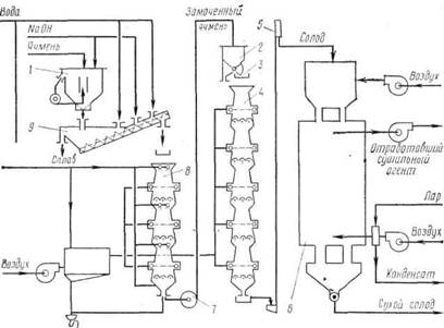 Солодовня ЛСХА работает следующим образом. Очищенное и отсортированное зерно гидротранспортером подают в замочный чан. В гидротранспортере ячмень отмывается от пыли и других загрязнений, а в замочном чане подвергается обработке 0,1%-ным раствором NаОН при температуре 9—10°С в течение 6 ч. Из замочного чана зерно направляется в моечный аппарат 9, где промывается и освобождается от легких примесей, и затем подается в первую камеру 8 для продолжения замачивания. Все три замочные камеры 8 расположены одна над другой в общей шахте и снабжены форсунками для орошения зерна водой. Продолжительность нахождения зерна в каждой камере — около 1.6 ч.