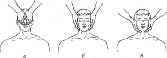 1. Глаза: ладонями закрыть верхнюю часть лица человека, глаза и лоб (Рис. 28 а). 2. Виски: закрыть ладонями виски (Рис. 28 б). 3. Уши: закрыть ладонями уши, кончики пальцев под шеей (Рис. 28 в). 4. Шестая чакра: одной ладонью закрыть лоб, а другой — затылок человека. 5. Затылок: подложить ладони под затылок. 6. Шея: обхватить ладонями шею. 1. Грудь: обе ладони, прижатые друг к другу, положить на грудь (Рис. 29 а). 2. Верхушки легких: положить ладони на плечи (Рис. 29 б). 3. Солнечное сплетение: положить руки на солнечное сплетение (Рис. 29 в). 4. Вторая чакра: закрыть область на ладонь ниже пупка (Рис. 29 г). |