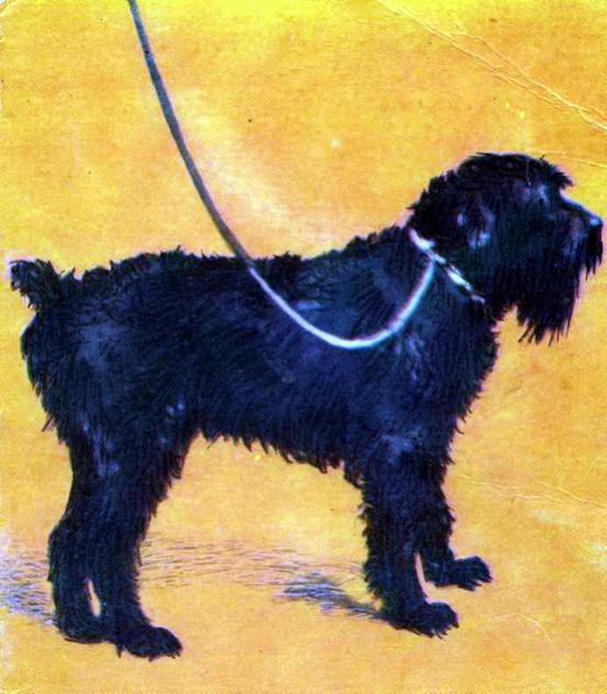 ЧЕРНЫЙ ТЕРЬЕР — выведен в питомнике „Красная звезда* (Советский Союз). Очень вынослив, неприхотлив. Используется для караульной и розыскной службы. Масть черная или черная с бурым отливом и сединой.