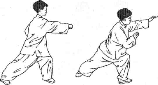 (Рис. 88). Движение должно быть плавным, без усилий. Постарайтесь забыть о существовании своего тела и сосредоточиться на ударе кулаком. Эта форма обратна форме 6. 10. Красота смотрится в зеркало. Не меняя положения, повернуться кругом, приняв левую стойку «лук и стрела». Движением левой руки образовать блок на уровне лица. Кисть правой руки должна при этом располагаться рядом с локтем левой руки (Рис. 89). Движения ощущайте как единый поток сознания, энергии и движения. Рис. 88 Рис. 89 Рис. 90 Рис. 91 Рис. 92 Рис. 93 11. Мах рукой из стойки «ложная нога». Слегка отвести назад левую ногу. При этом она остается впереди правой ноги, образуя левую стойку «ложная нога». Тело обращено вправо. Одновременно махом вниз перевести левую руку от правого плеча, расположив ее перед левой ногой (Рис. 90). Сознание следует сосредоточить на махе рукой. |
