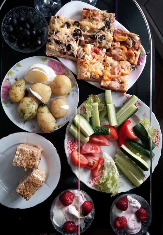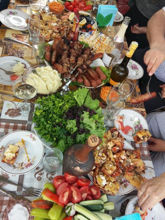 А я вот на выходные был на дне рождении тещи. Очень понравился праздничный стол и вино и местное пиво. Пицца, шашлыки и зелень - вкуснотища! И у нас такой стол стоит копейки. А на втором фото ДР сына - уже детские угощения.