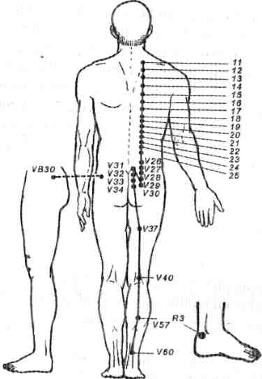 Подушечкой большого пальца последовательно помассируйте точки меридиана мочевого пузыря, начиная с У12 фэнмэнь до У34 сяляо. Массаж делается вращательными движениями (5060 круглых движений в 1 минуту) с легким надавливанием до появления интенсивного покраснения и ощущения тепла. По точкам нужно пройти 23 раза. Правой рукой, начиная от головы, пройдите •виз вибрирующими движениями с коротким Сильным давлением (160200 колебаний в минуту) в течение 56 минут, до ощущения сильного тепла. Затем произведите ритмичное похлопывание обеими ладонями или кулаком в течение 12 минут. Рис. 1 Прерывистым надавливанием пройдитесь по точкам УВЗО хуаньтяо, УЗ 7 иньмэнь, У40 вэйчжун, У57 чэншэнь, У60 куньлунь, КЗ тайсин. Каждую точку нужно массировать 12 минуты, до появления интенсивного покраснения и чувства тепла (Рис. 1). |